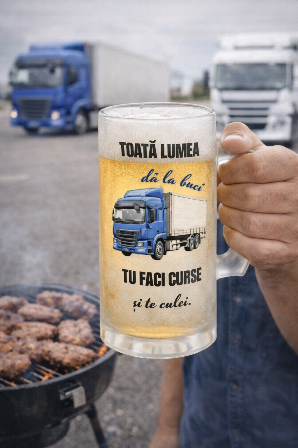 Cu un design modern și un mesaj amuzant – „Toată lumea dă la buci, tu faci curse și te culei” – această halbă este ideală pentru momentele de relaxare după o zi lungă pe drum.